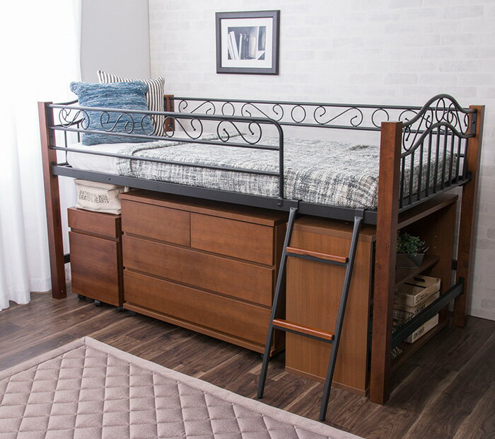 商品名 クラシック調ハイタイプベッド ミドルイプ商品説明 ○ベッド下たっぷりのフリースペース!チェストや布団などもたっぷり収納できます!○はしご位置も自在に変えれる、置く場所を選ぶことなく配置できます○天然木×アイアンフレームがぐっとオシャレな空間を演出します○6cm角の木柱、前面フレーム設計○ワイヤーメッシュの床板で年中快適♪